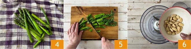 Escorra os aspargos, seque-os com um pano 4 e corte-os em pedaços 5. Coloque as amêndoas em um mixer 6 e triture-as grosseiramente.