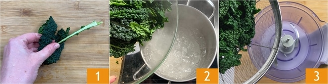 Para fazer o pesto de cavolo nero, primeiro limpe o cavolo nero separando as folhas do caule central 1. Leve uma panela de água para ferver e escalde as folhas por 3-5 minutos 2. Transfira o cavolo nero escaldado para um processador 3.