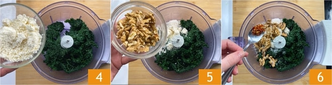 Adicione o queijo ralado 4, as nozes 5, o sal e a pimenta 6.