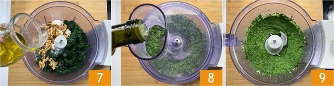 Adicione 40 g de azeite 7 e comece a misturar. Enquanto o processador está funcionando, despeje os restantes 30 g de azeite aos poucos 8. Quando você obtiver uma consistência cremosa e homogênea, seu pesto de cavolo nero está pronto 9!