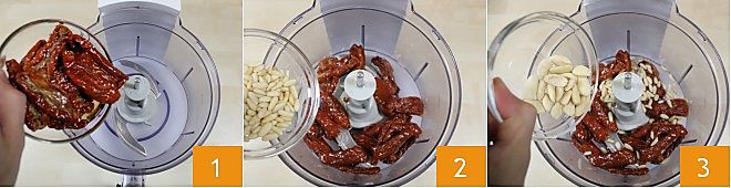 Para preparar o pesto de tomates secos, coloque os tomates secos no liquidificador com o óleo em que estão conservados 1, adicione os pinhões 2 e as amêndoas sem pele 3.