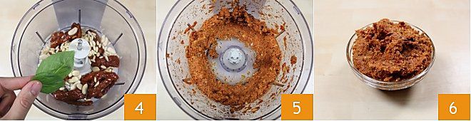 Adicione as folhas de manjericão 4 e misture até obter uma mistura bastante granulosa 5. Neste ponto, o seu pesto de tomates secos está pronto para ser usado como um condimento saboroso 6!