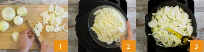 Para realizar a piadina com taleggio e cebolas caramelizadas, primeiro descasque as cebolas, depois corte-as em fatias com espessura de cerca de 3-4 mm 1. Em uma frigideira aqueça as cebolas 2 com um fio de óleo 3.
