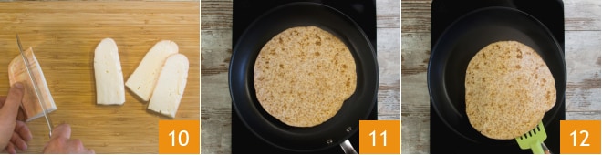 Corte o taleggio em fatias de cerca de ½ cm 10. Aqueça na frigideira a piadina integral por cerca de 30 segundos 11, vire a piadina 12 para aquecê-la por mais 30 segundos.