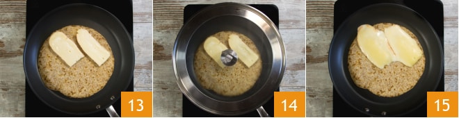 Disponha apenas em uma metade as fatias de taleggio 13, cubra com a tampa 14 e deixe que o taleggio derreta em fogo baixo 15.
