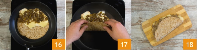 Coloque as cebolas caramelizadas sobre o queijo derretido 16 e feche a piadina dobrando-a ao meio 17. Aprecie a piadina com taleggio e cebolas caramelizadas bem quente 18.
