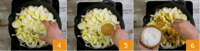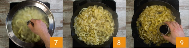 Misture, cubra com uma tampa 8 e continue cozinhando por cerca de 20 minutos em fogo baixo, mexendo de vez em quando. Após esse tempo, destampe 8 e continue cozinhando por mais 45 minutos em fogo baixo, mexendo frequentemente. Quando as cebolas estiverem bem macias, adicione o vinagre balsâmico 9, deixe evaporar e depois desligue o fogo.