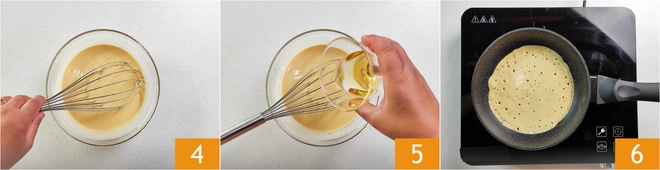 Misture com um batedor manual para obter uma massa lisa 4. Em seguida, adicione o óleo vegetal 5 e misture novamente até ficar bem homogêneo. Você deve obter uma massa lisa e sem grumos, semelhante à de crepes. Aqueça em fogo baixo uma frigideira para crepes ou antiaderente com diâmetro de 20 cm e despeje uma colher de massa. Gire a frigideira para criar uma camada uniforme. A superfície deve engrossar e formar bolhas 6.