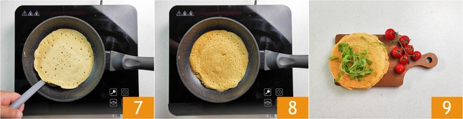 Vire a piadina com a ajuda de uma espátula 7 e continue cozinhando por mais alguns minutos do outro lado 8. Transfira então a piadina para um prato e continue desse modo até acabar a massa. À medida que as piadinas ficam prontas, sobreponha-as para que o calor residual as mantenha macias e fáceis de enrolar. Suas piadinas de grão-de-bico estão prontas para serem recheadas 9!