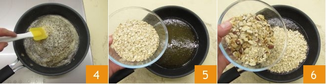 Cozinhe por 10 minutos em fogo médio até criar um xarope 4, então desligue o fogo e adicione a aveia 5, as frutas secas previamente picadas 6