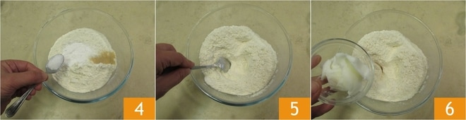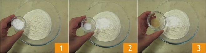 Para preparar a piadina grossa romagnola, em uma tigela, coloque a farinha 00, o fermento instantâneo 1, o bicarbonato 2 e o açúcar mascavo 3.