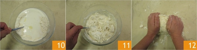 Misture primeiro com a colher para incorporar os ingredientes 10 e, assim que todos os líquidos estiverem bem absorvidos 11, transfira a massa para uma superfície de trabalho e amasse com as mãos 12.