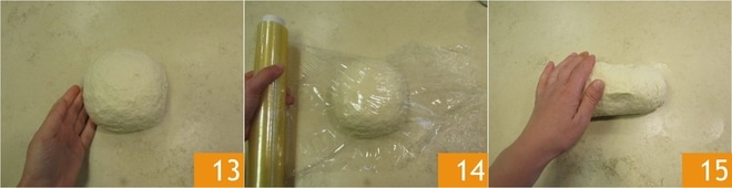 Você deve obter uma massa lisa e homogênea 13. Embrulhe-a em filme plástico 14 e deixe-a descansar na geladeira por pelo menos 10 minutos. Pegue a massa novamente e forme um cilindro 15.