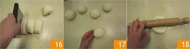 Divida a massa em 5 partes iguais 16 e forme bolas 17. Usando um rolo e um pouco de farinha, abra uma das bolas 18.