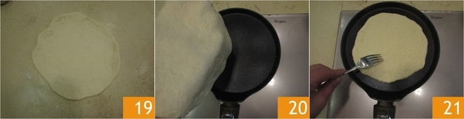 Você deve obter uma espessura de 5-6 mm 19. Aqueça bem uma chapa antiaderente e coloque a piadina 20. Deixe cozinhar por cerca de 2 minutos e meio, furando a superfície com os dentes de um garfo para não inchar 21.