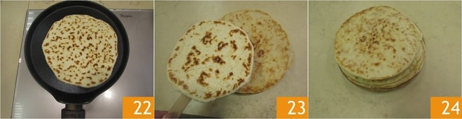 Vire a piadina e cozinhe por mais 2 minutos e meio 22. Enquanto isso, abra a próxima bola e continue assim até terminar a massa. À medida que as piadinas estiverem prontas, você pode empilhá-las 23 24. As piadinas grossas estão prontas para serem recheadas ou para enriquecer a cesta de pão!