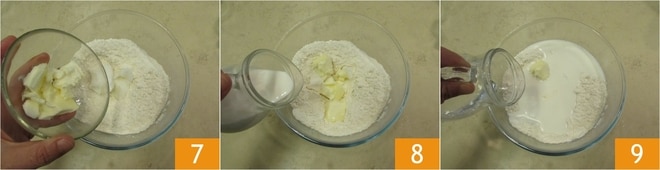Adicione a manteiga em temperatura ambiente 7, o leite 8 e a água 9.
