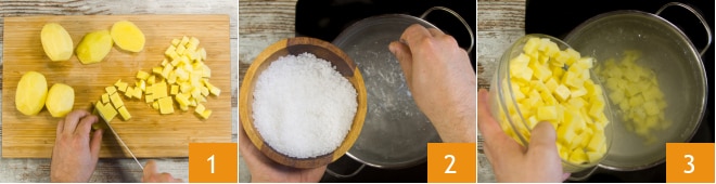 Quando as batatas estiverem prontas, escorra-as diretamente na frigideira 7, ajuste o sal e a pimenta 8 e tempere com o alecrim picado 9.
