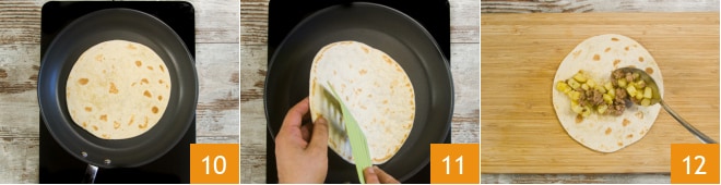 Aqueça a piadina em uma frigideira antiaderente por 30 segundos 10, depois vire-a usando uma espátula 11 e aqueça por mais 30 segundos do outro lado. Nesse ponto, coloque a piadina quente em uma tábua e recheie com o recheio 12