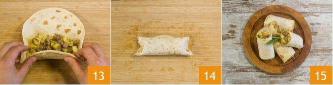 Levante a piadina por uma borda, feche as bordas laterais da massa para que o recheio não escape 13 e enrole-a 14. Corte a piadina com linguiça e batatas ao meio e sirva bem quente 15.