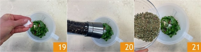 Salgue 19, adicione pimenta 20 e, por último, o orégano seco 21.