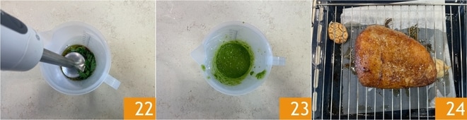 Bata com um mixer de imersão 22 para obter um molho homogêneo 23. Quando a picanha estiver pronta, retire do forno e deixe descansar por 10 minutos antes de fatiar 24, isso ajudará a manter os sucos dentro da carne.