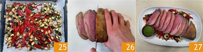 Enquanto isso, os legumes também estarão prontos 25, corte a carne em fatias 26 e sirva sua picanha assada no forno com os legumes e o molho chimichurri 27.