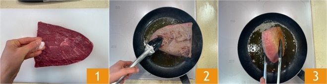 Para preparar a picanha, salgue a carne de ambos os lados 1. Em uma frigideira, aqueça um fio de azeite de oliva e doure a picanha em fogo médio-alto 2 por 2-3 minutos de cada lado 3, para obter uma crosta dourada.