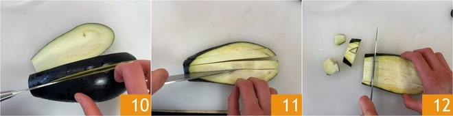 Corte as pontas das berinjelas e corte em fatias de cerca de 1 cm 10, depois corte em palitos da mesma espessura 11 e, por fim, corte em cubos 12.