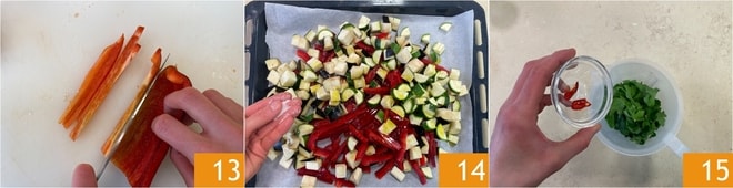 Limpe os pimentões e corte em palitos de 1 cm 13. Agora, reúna os legumes em uma assadeira forrada com papel manteiga e tempere-os com óleo, sal e pimenta 14. Coloque também os legumes no forno e asse por 20 minutos. Enquanto isso, prepare o molho chimichurri: em um copo, adicione a salsinha e a pimenta 15.