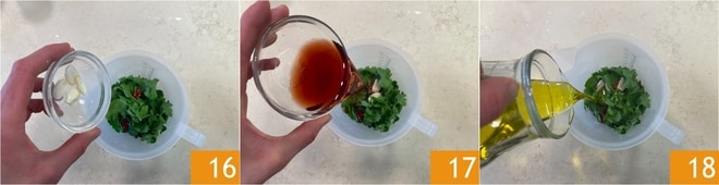 Adicione também o alho 16, o vinagre de vinho tinto 17 e o azeite de oliva 18.