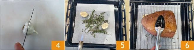 Divida horizontalmente a cabeça de alho 4, coloque-a em uma assadeira forrada com papel manteiga junto com o alecrim, o tomilho e a sálvia. Se preferir, você pode aquecer os aromas com um maçarico para intensificar o sabor 5. Coloque a picanha sobre uma grade posicionada acima dos aromas, de modo que a gordura da carne possa pingar na assadeira abaixo 6.