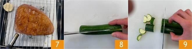 Doure a carne com o maçarico para um efeito defumado 7. Asse em forno ventilado pré-aquecido a 180°C por 30 minutos. Enquanto isso, cuide do acompanhamento: corte as pontas das abobrinhas e divida-as ao meio no sentido do comprimento 8, depois corte em meias-luas 9.