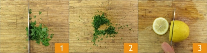 Para realizar a piccata de frango, prepare primeiro o Caldo de galinha (ou frango). Lave e pique as folhas de salsinha com uma faca 1 2. Lave bem e depois corte meio limão em fatias 3.