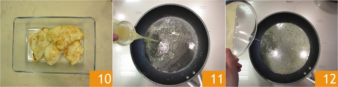 Remova os peitos da frigideira e reserve-os 10. Na mesma frigideira, despeje o caldo de frango 11 e 30 g de suco de limão 12.
