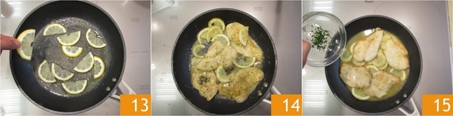 Deixe ferver suavemente, depois adicione as fatias de limão e cozinhe por cerca de 1 minuto 13. Adicione também os peitos de frango 14, cozinhe por aproximadamente 1 minuto em fogo médio, tempere com a salsinha 15.