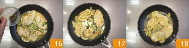 Adicione também as alcaparras bem escorridas do óleo de conservação 16, cozinhe por mais um minuto ou o tempo necessário para reduzir um pouco o líquido. Retire a frigideira do fogo e adicione os restantes 40 g de manteiga em pedaços pequenos 17, deixe derreter mexendo bem. Pique a gosto e sirva imediatamente a piccata de frango 18.
