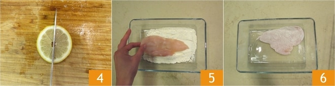 Divida cada fatia ao meio 4 e reserve. Esprema a outra metade do limão e coe o suco. Por último, enfarinhe bem as fatias de frango 5 6.