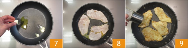 Aqueça o óleo e 60 g de manteiga em uma frigideira em fogo baixo 7, coloque os peitos de frango, doure-os 8. Uma vez dourados, adicione sal 9 e vire os peitos de frango para dourá-los também do outro lado, adicione sal novamente.
