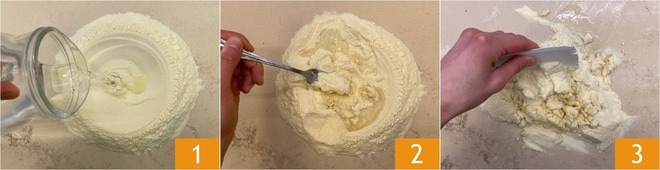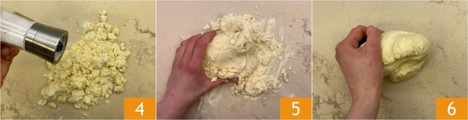 Adicione uma pitada de sal 4 e trabalhe com as mãos 5 até obter uma massa elástica e homogênea 6. Embrulhe-a em filme plástico e deixe descansar por 30 minutos na geladeira.