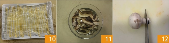Coloque os pici em uma bandeja forrada com um pano polvilhado com sêmola e cubra com filme plástico 10. Passe para os cogumelos: mergulhe os porcini secos para reidratá-los 11, depois limpe os cogumelos frescos removendo a parte terrosa da base 12.