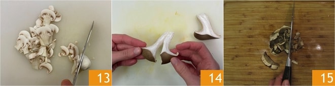 Corte os portobello e os champignons em fatias finas 13, quebre os pleurotus com as mãos 14 e deixe os cogumelos pequenos inteiros. Escorra os porcini secos e pique-os finamente com uma faca 15.