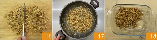 Agora cuide das nozes: pique grosseiramente os miolos 16 e toste-os por alguns minutos em uma frigideira com um fio de óleo, para que liberem os óleos naturais 17. Quando começar a sentir o aroma, desligue o fogo e transfira as nozes tostadas para uma tigela. Reserve 18.