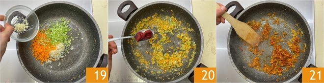 Na mesma frigideira, adicione o óleo e os vegetais para o refogado que você já picou anteriormente, ou seja, cebola, cenoura, aipo e alho 19. Deixe o refogado murchar em fogo baixo, depois adicione o extrato de tomate 20 e misture bem para incorporá-lo 21.