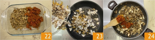 Transfira o refogado para a tigela com as nozes e reserve 22. Ainda na mesma frigideira, coloque os cogumelos com um fio de óleo 23, adicione sal, pimenta e cozinhe em fogo alto por 8-10 minutos, mexendo frequentemente. Quando os cogumelos estiverem dourados, adicione os porcini secos picados e o refogado 24.