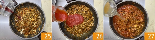 Despeje o vinho tinto 25 e deixe evaporar completamente a parte alcoólica, depois adicione as nozes tostadas e o purê de tomate 26, enxaguando a jarra com um pouco de água. Despeje também o caldo de legumes quente 27.