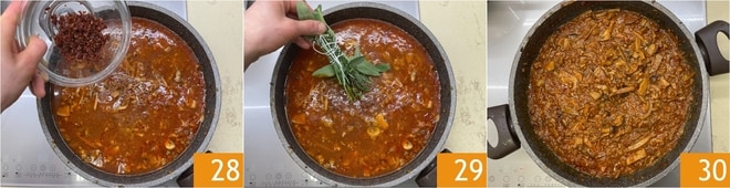 Por último, adicione os tomates secos picados 28 e um maço de ervas aromáticas frescas que você amarrou com um barbante 29. Deixe cozinhar em fogo baixo por 2 horas. Quando o ragu estiver pronto 30, leve uma panela de água salgada para ferver para os pici.