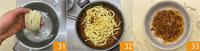 Cozinhe os pici por 6-7 minutos 31, depois escorra-os na frigideira com o molho e misture para incorporar tudo 32. Seus pici com ragu de cogumelos e nozes estão prontos para serem saboreados 33!