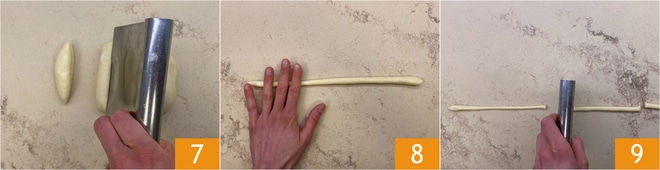 Após o tempo de descanso da massa, divida-a em porções menores 7 e forme cordões longos e finos 8. Corte os cordões para obter pici de comprimento aproximadamente igual ao dos espaguetes 9.