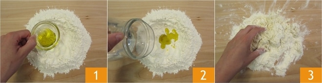 Para preparar os pici com tomatinhos e ricota ao aroma de limão, comece pela massa fresca: coloque a farinha em forma de montinho numa superfície plana e adicione o óleo 1 e a água morna aos poucos 2, enquanto mistura com as mãos 3.